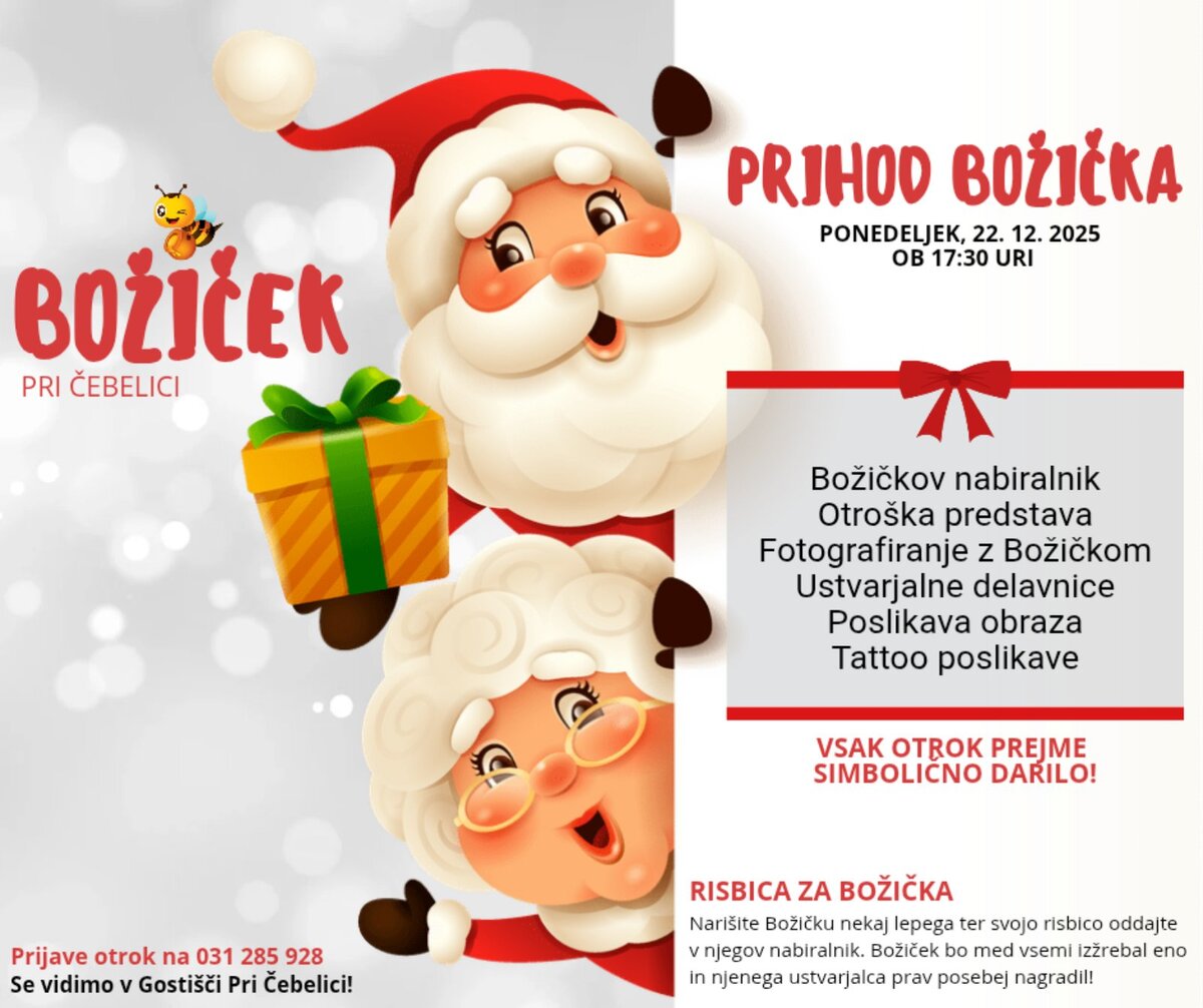 V ponedeljek, 22.12.2025, bo ob 17.30 uri v Gostišču pri Čebelici potekal dogodek: PRIHOD BOŽIČKA!