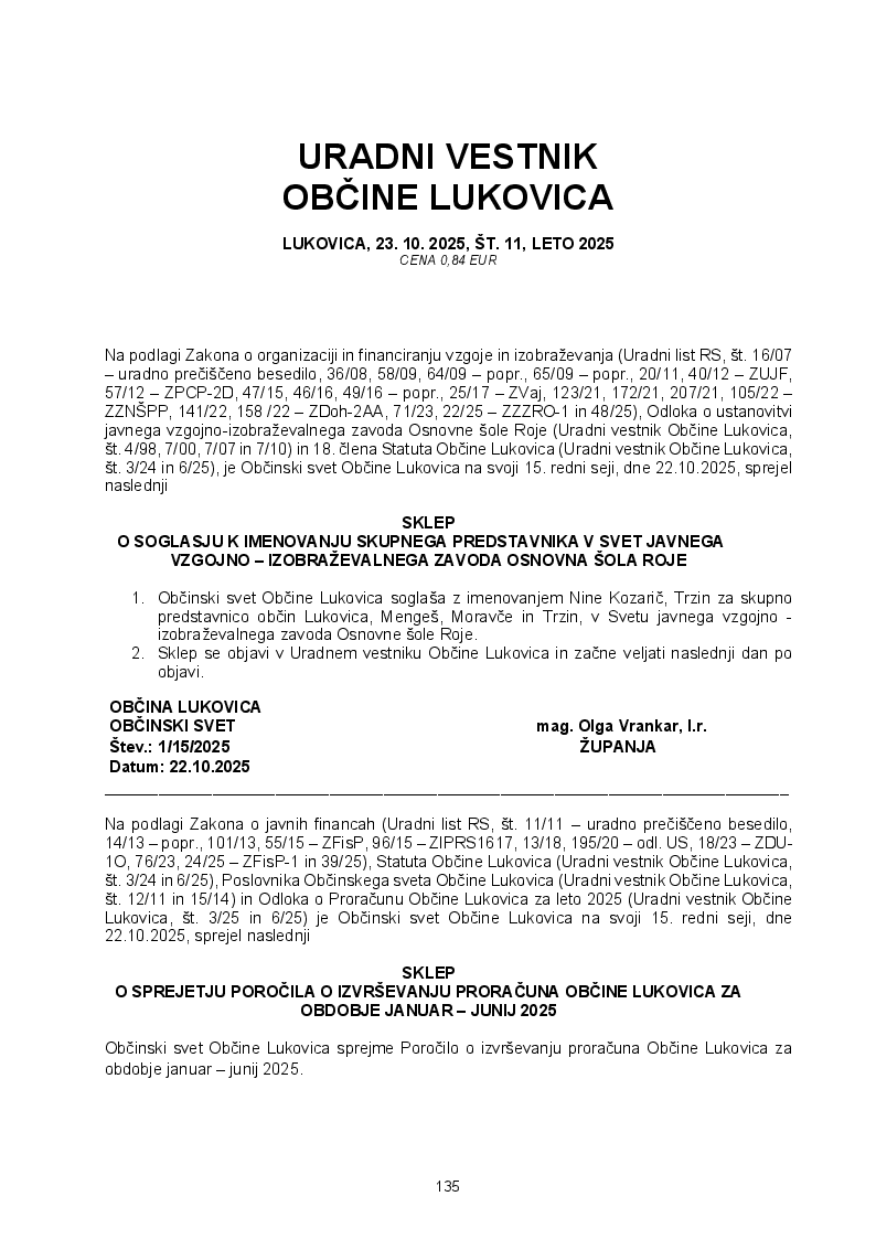 SKLEP O SPREJETJU POROČILA O IZVRŠEVANJU PRORAČUNA OBČINE LUKOVICA ZA OBDOBJE JANUAR – JUNIJ 2025 (Uradni vestnik, 23.10.2025, številka 11)