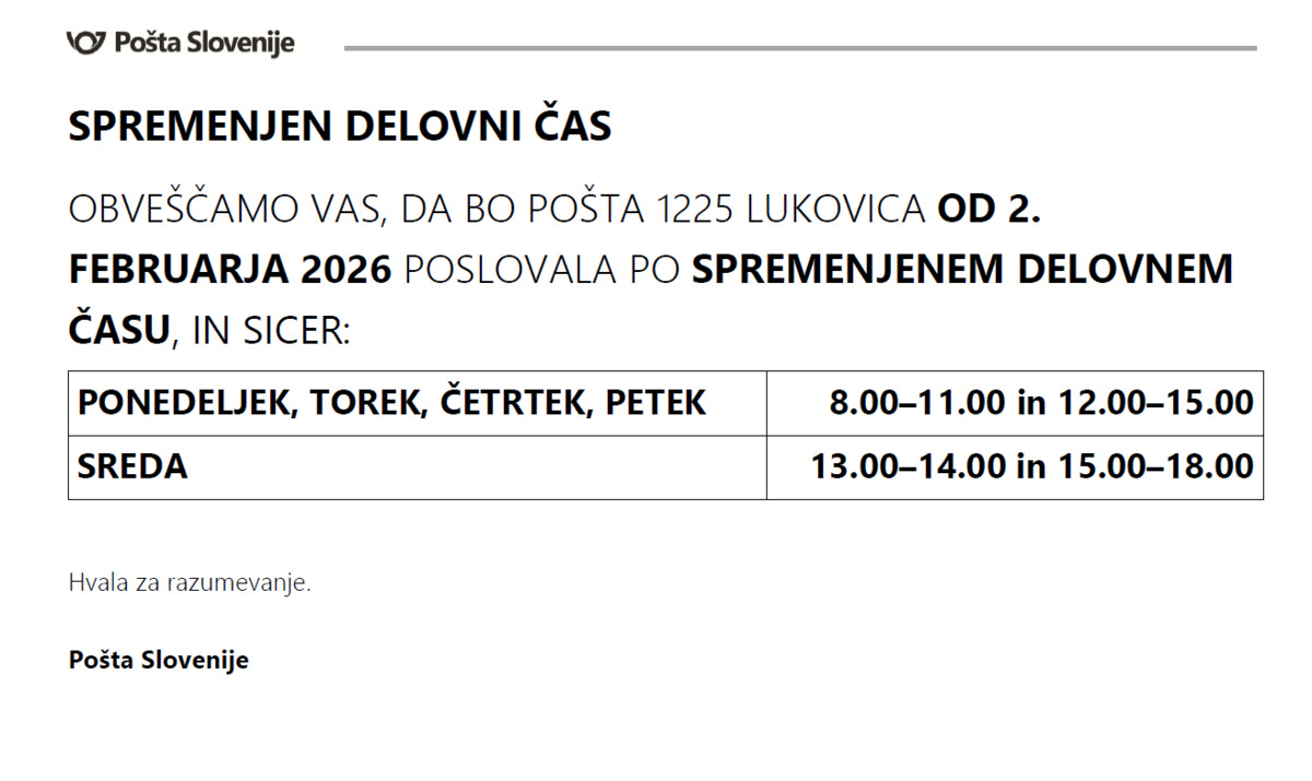 Obveščamo vas, da se z 2. februarjem 2026 spreminja delovni čas pošte 1225 Lukovica.