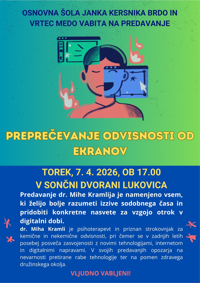 📢 Osnovna šola Janka Kersnika Brdo in Vrtec Medo vabita na zanimivo in aktualno predavanje o preprečevanju odvisnosti od ekranov