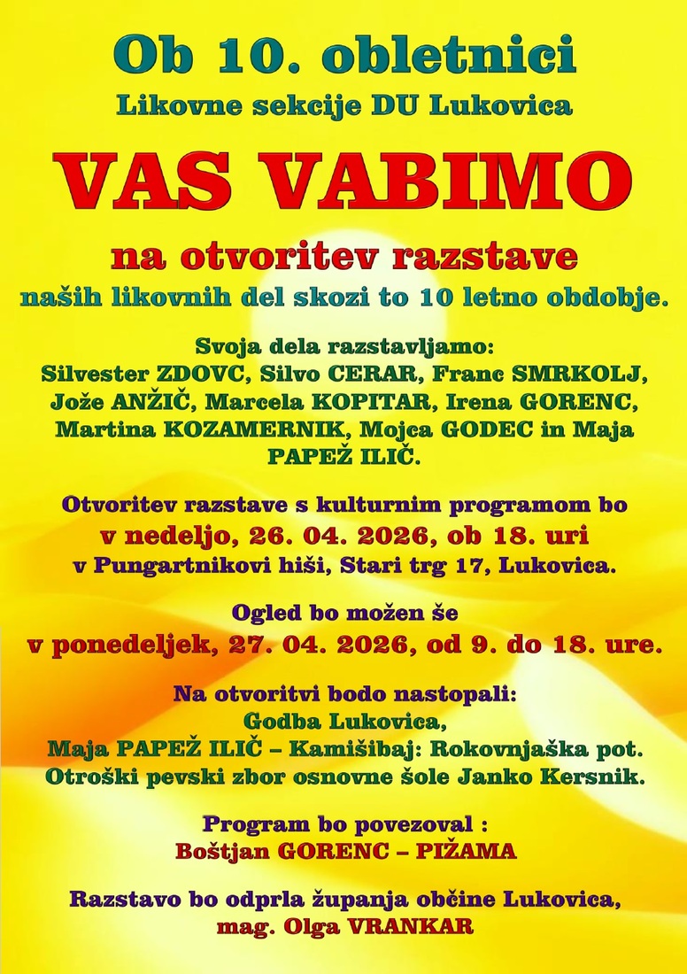 Likovna sekcija DU Lukovica vas ob 10. obletnici delovanja vabi na otvoritev razstave, na kateri si boste lahko ogledali dela članov skozi desetletje ustvarjanja.