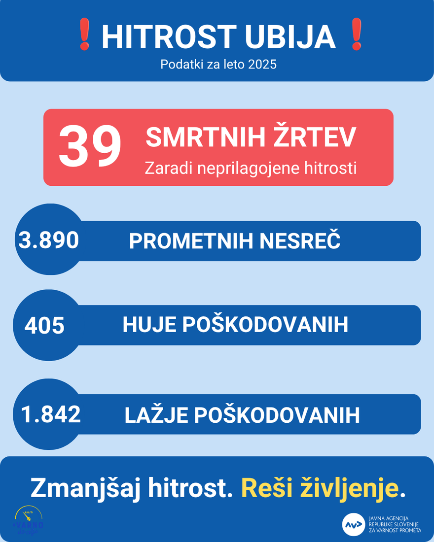 Hitrost ni le številka – vpliva na možnost reakcije, dolžino zavorne poti in posledice nesreč. Zato voznike pozivamo, da hitrost prilagodijo razmeram in omejitvam ter prispevajo k večji varnosti na cestah.