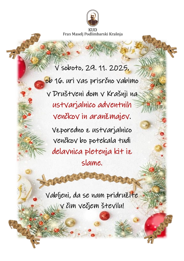 KUD Fran Maselj Podlimbarski Krašnja vas v soboto, 29.11.2025, po 16. uri prisrčno vabi v Društveni dom v Krašnji na ustvarjalnico adventnih venčkov in aranžmajev.