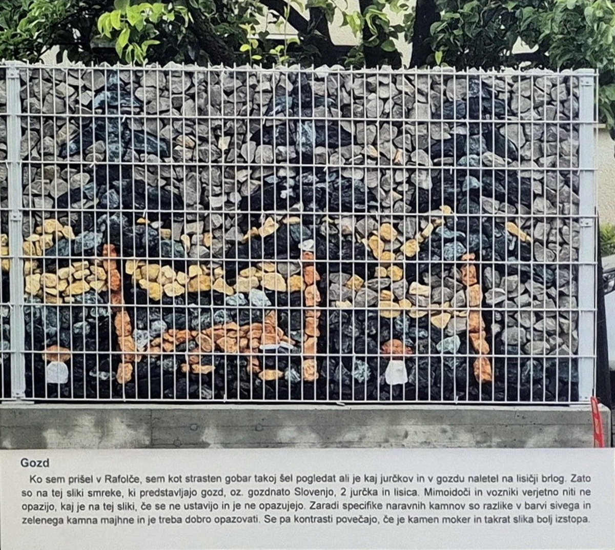 Na hodniku Pungartnikove hiše so bile na ogled fotografije iz galerije na prostem, na katerih so prikazani unikatni mozaiki iz barvnih kamnov v Gabion ograji, ki jih je ustvaril naš član Silvo Zdovc iz Rafolč. Ker mu je ograja vzela kar veliko časa in ker so živali tudi v njegovih mozaikih enostavno ni imel časa, da bi naslikal še kakšno sliko na našo izbrano temo. Na kratko je povedal nekaj besed o sami izdelavi, vzrokih za izdelavo in nam razložil kaj predstavljajo motivi. Vse je povabil tudi v Rafolče na ogled v živo.
