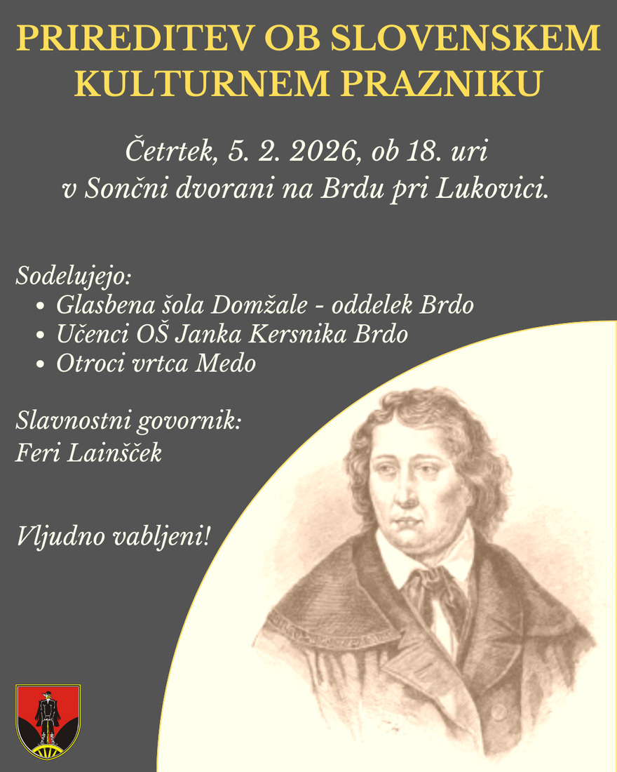 Vabljeni, da se nam pridružite na Prireditvi ob slovenskem kulturnem prazniku, ki bo v četrtek, 5.2.2026, ob 18. uri v Sončni dvorani na Brdu pri Lukovici.